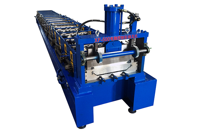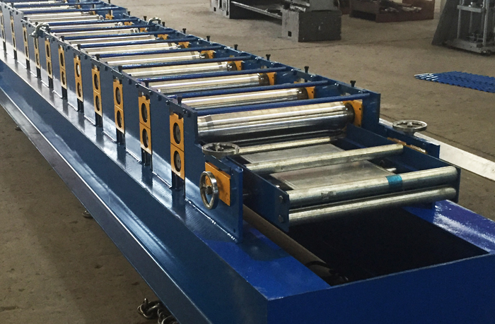 1、成形主機:機架為396H型鋼焊接而成,牆板式結構,鏈輪鏈條傳動,18道滾壓成型,電機功率15KW,壓製厚度為0.6mm。成型速度25米/分,外形尺寸:8.7米×1米×1.1米,整機重量為:4噸。