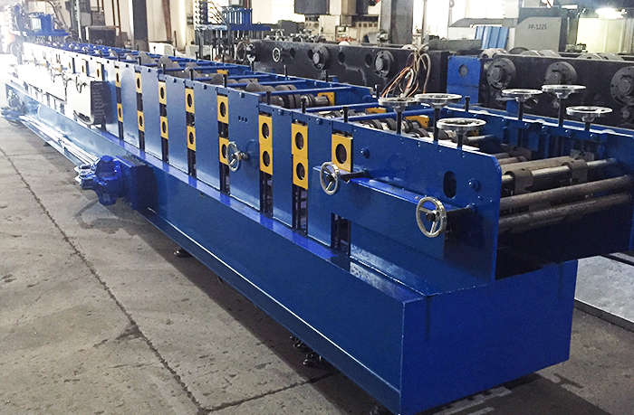 3、成型主機:機架用446H鋼焊接而成,機組長度為9.85米,寬度為1.3米,高度為1.70米,整機重量為9噸,采用隔套式手動調節規格方式,軋製規格為寬度140-250mm,高度為50-80mm,壓製板材質Q235,厚度為2-3mm,成型速度為20米/分,主機十四道滾壓成型,輪子材料為Cr12優質合金鋼,淬火硬度為HRC60-62,輥軸材料為Ф78圓45#優質碳素鋼,經調質處理,硬度為HRC28~32。